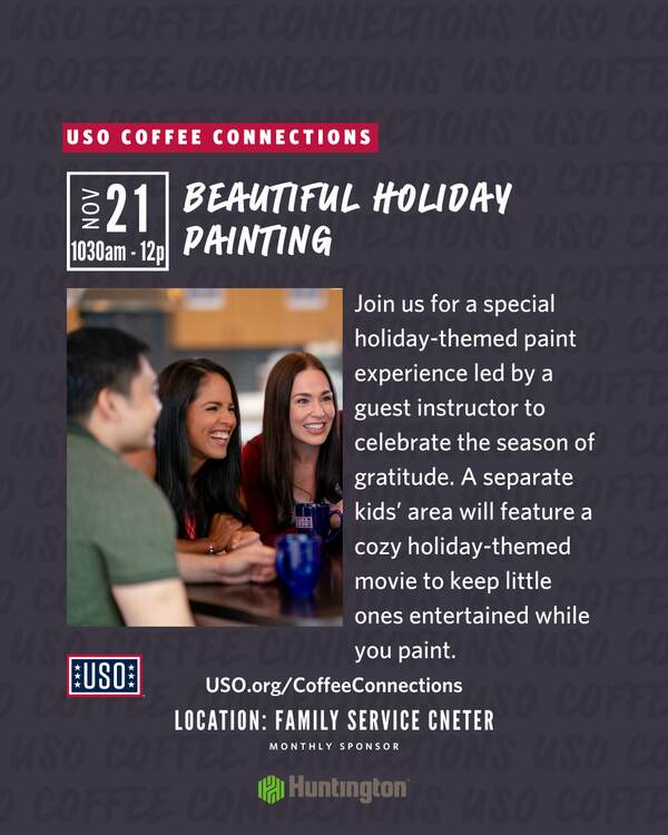 Join us at the USO for Coffee, Creativity, and Community! Each month, enjoy a unique craft project, delicious snacks, and the chance to relax and connect with fellow military spouses.