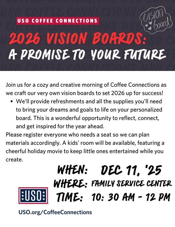 Join us at the USO for Coffee, Creativity, and Community! Each month, enjoy a unique craft project, delicious snacks, and the chance to relax and connect with fellow military spouses.