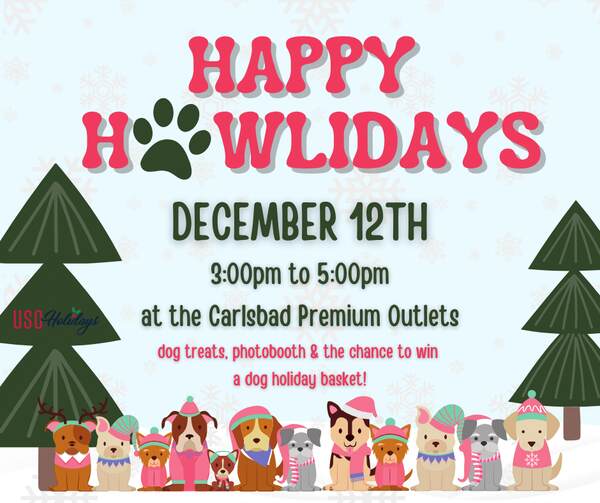 🐾🐶 Happy Howlidays! Santa Paws is coming to town! 🐶🐾 Join the Camp Pendleton USO at the Carlsbad Premium Outlets on Friday, December 12th from 3:00-5:00 with your furry friend to enjoy, 📷Photos with Santa 🍪Dog Treat craft activity ❄️ Bandanas & the opportunity to win one of two Dog Themed Holiday Baskets Registration required #USOHolidays #CookieWeek #USO #USOCampPendleton