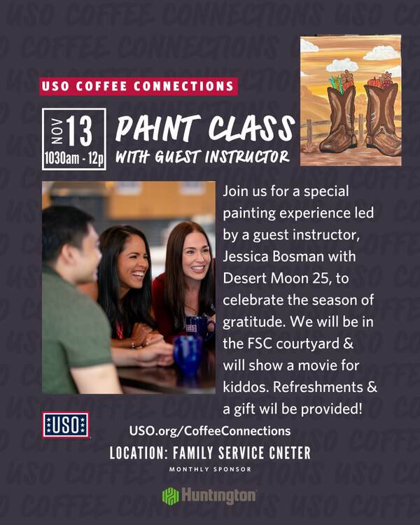 Join us at the USO for Coffee, Creativity, and Community! Each month, enjoy a unique craft project, delicious snacks, and the chance to relax and connect with fellow military spouses.