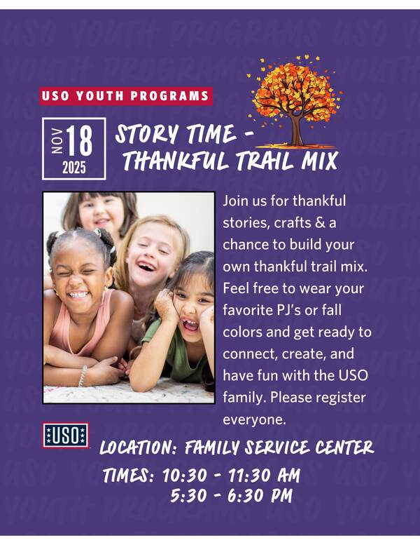 This is a nut-free event, perfect for little ones and families to enjoy together. Come celebrate the season of gratitude with stories, creativity, and sweet smiles! Feel free to wear your favorite fall colors or PJ’s and get ready to connect, create, and have fun with your USO family. Please register everyone needing a seat.