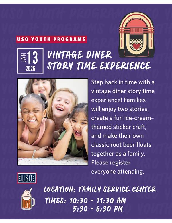 Our USO volunteers will be dressed as classic diner waiters, and children will receive a diner hat to wear and take home!