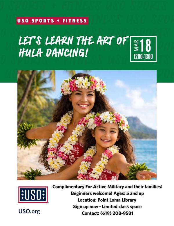 Join USO San Diego for an all-ages hula experience designed for active-duty military and their families. Guided by the spirit of aloha, this class blends gentle movement, storytelling, and mindfulness to support wellness, connection, and joy.