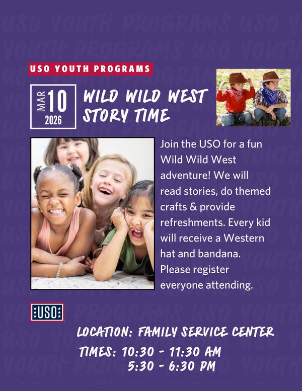 Join the USO for a fun Wild-Wild West adventure! We will read stories, do themed crafts & provide refreshments. Every kid will receive a Western hat and bandana. Please register everyone attending.
