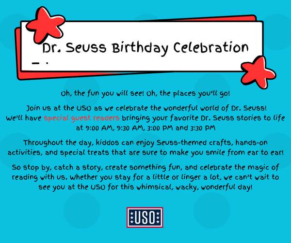 Pleas join us at the USO for our Dr. Seuss Birthday Celebration!