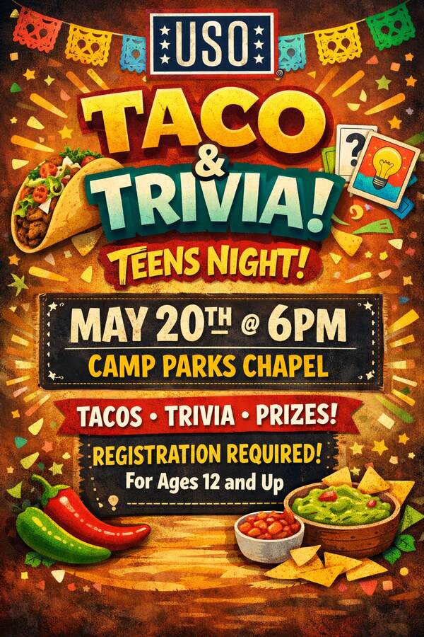 The USO is hosting a night full of tasty tacos, fun trivia, and great vibes! Join us for a Teen Taco & Trivia Night designed just for ages 12 and up. Bring your friends, test your knowledge, and enjoy some delicious bites along the way!